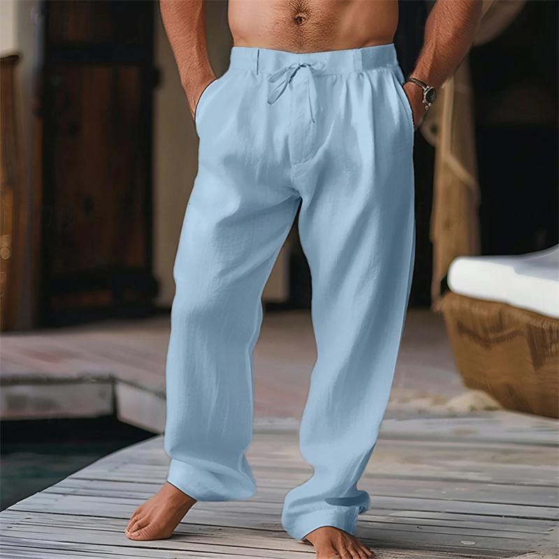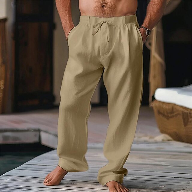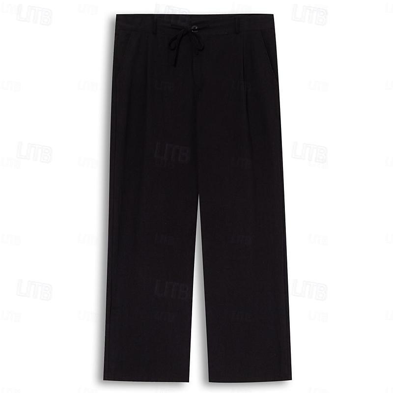 Highlights [Fabric] : Expertly crafted from a blend of breathable linen and 100% cotton, these trousers offer a soft and airy feel perfect for spring and summer. The lightweight fabric ensures comfort and ease throughout the day. [Fit] : Designed in a relaxed-fit style with a mid-waistline, these trousers feature a classic straight-leg cut that provides a sleek and timeless look, ideal for both casual and holiday wear. [Design Highlights] : These versatile trousers come with an elastic waistband and a drawstring, offering an adjustable fit for maximum comfort. The inclusion of pleats adds a touch of sophistication, while the practical zipper and button fly ensures ease of use. [Occasions] : Perfectly suited for beach outings, casual daily wear, or holiday adventures, these trousers blend comfort and style effortlessly, making them a must-have for any warm-weather wardrobe. [Size Range] : Available in a variety of sizes from S to 3XL, these trousers cater to a wide range of preferences, ensuring the ideal fit for different body types.