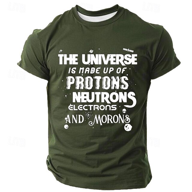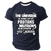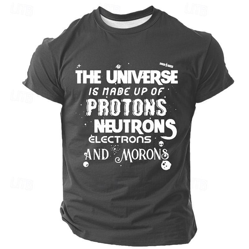 Highlights [Fabric:] Crafted from high-quality polyester, this men's t-shirt offers a comfortable and breathable wear with stretchy elasticity, making it perfect for the warmer spring and summer seasons. [Fit Type:] The shirt features a tailored fit, providing a classic and flattering silhouette that complements the body's natural shape while allowing ease of movement. [Design Highlights:] Showcasing a clever 3D print design, this t-shirt humorously reads, "The Universe Is Made Up Of Protons, Neutrons, Electrons, And Morons," displayed in varying fonts and sizes for a unique and stylish appeal. The crew neck and short sleeve structure offer a vintage and cool vibe, with meticulous stitching details that add to its durability. [Occasions:] Ideal for holidays, parties, or casual outings, this shirt is a perfect choice for those who appreciate humor and a hint of science in their wardrobe, making it a standout piece for social gatherings or relaxed weekends. [Size Range:] Available in a variety of sizes from S to XXXL, this t-shirt caters to a broad range of adult wearers, ensuring a great fit for everyone looking to add a touch of wit to their apparel.