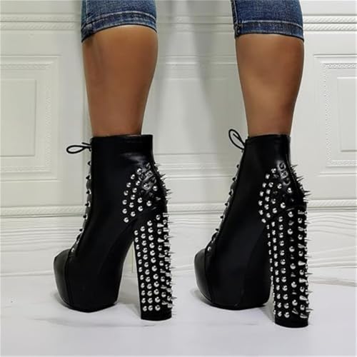 • These soft pu/patent leather studded ankle boots heel height is 14.5 cm(5.7 inch), platform 4.5 cm(1.8 inch). Sexy rivets heels short boots for prom women girls, chic street trendy boots.