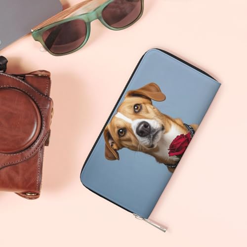 Pu Leather Wallet For Women Girl, Zip Around Credit Card Holder Dog Holding A Rose Long Wallet Clutch Purse Waterproof Travel Handbag 1