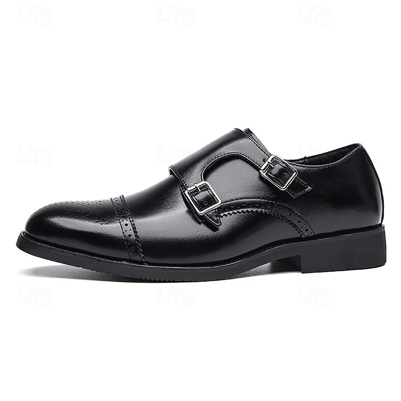 Highlights [Fabric] : Crafted from high-quality PU leather, these men's double monk strap shoes offer durability and a sophisticated finish. The PU-lined interior ensures maximum comfort for prolonged wear. [Cut] : The classic round toe design complements the rich brown hue, creating a timeless appeal suitable for a range of formal and semi-formal settings. [Design Highlights] : Featuring double buckles, these shoes are adorned with elegant brogue detailing that adds a modern twist to their classic cap toe style. The rubber outsole provides reliable slip resistance and long-lasting traction. [Occasions] : Perfect for weddings, formal events, and business settings, these shoes enhance your attire with their elegant design and subtle detailing, making them a versatile addition to any wardrobe. [Size Guide] : Available in sizes ranging from US6 to US12, these shoes are designed to offer a comfortable fit for a broad spectrum of foot sizes, ensuring everyone can enjoy a touch of classic elegance.