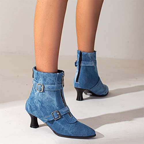 Elbslutt Women's Low Kitten Heel Booties Pointed Toe Ankle Boots Zip Buckles Strap Short Boots Dress Shoes 5