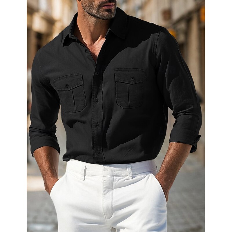 This versatile shirt boasts a classic point collar and long sleeves with buttoned cuffs, allowing for adaptable styling. The two front chest pockets with flap closures add both functionality and a touch of modern style. The solid color design serves as a canvas for effortless pairing with various bottoms, from jeans to tailored trousers.