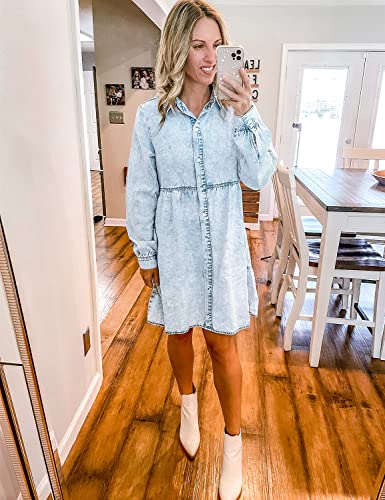 LookbookStore Long Sleeve Denim Dress for Women Jean Dress Button Down Casual Babydoll Denim Shirt Dress 3