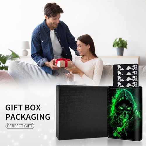 More information about Men's Slim Wallet,Pop Up Credit Card Holder Wallet,Leather RFID Blocking Metal Card Case for Coins,Debit Cards-Green Skull