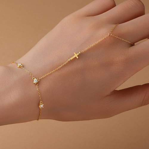 HOT ! 14K Gold Plated Dainty Cross Hand Link Chain for Women S925 Sterling Silver Cross Pendant Bracelet Ring for Mom Daughter Trendy Jewelry Christmas Easter Teacher Bracelet