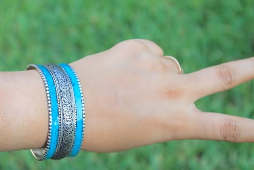 • Boho chic ornate Tibetan mosaic cuff bracelet made of blue stabilized-Turquoise and stainless steel metal.