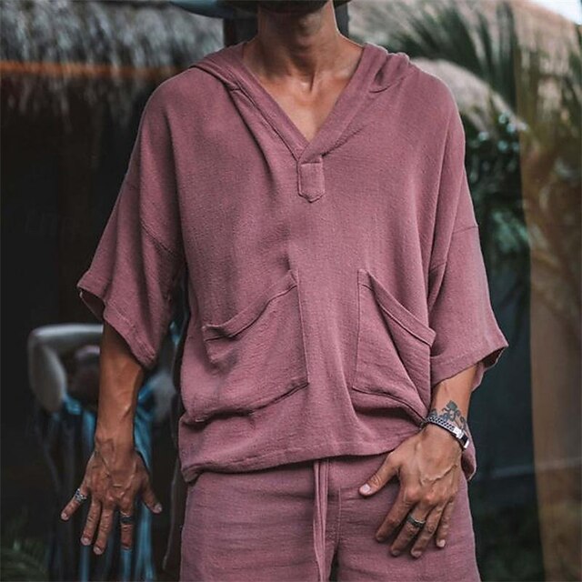 More information about Men's Linen Set T-shirt Suits 2 Pieces Outfits Short Sleeve Hooded Summer Plain Fashion Casual 2 Piece Front Pocket Vacation Daily Wear Going out Light Pink Black White Top Tee for Men