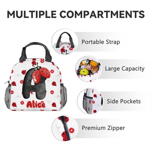 Custom School Backpack with Lunch Box Set for Kids, 3Pcs Ladybug Backpacks Matching Combo for Girls, Cute White Bookbag and Pencil Pouch Bundle 4