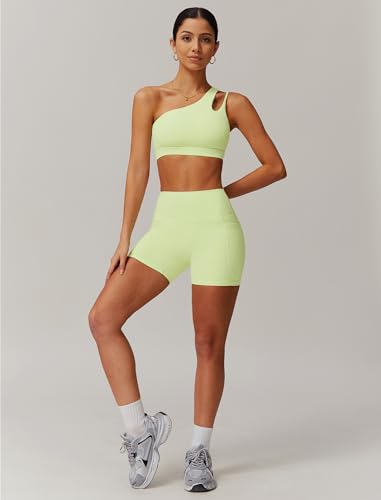 Womens Workout Sets Single Shoulder Straps Sport Bra Matching Shorts 2 Piece Gym Yoga Active Outfits with Pockets