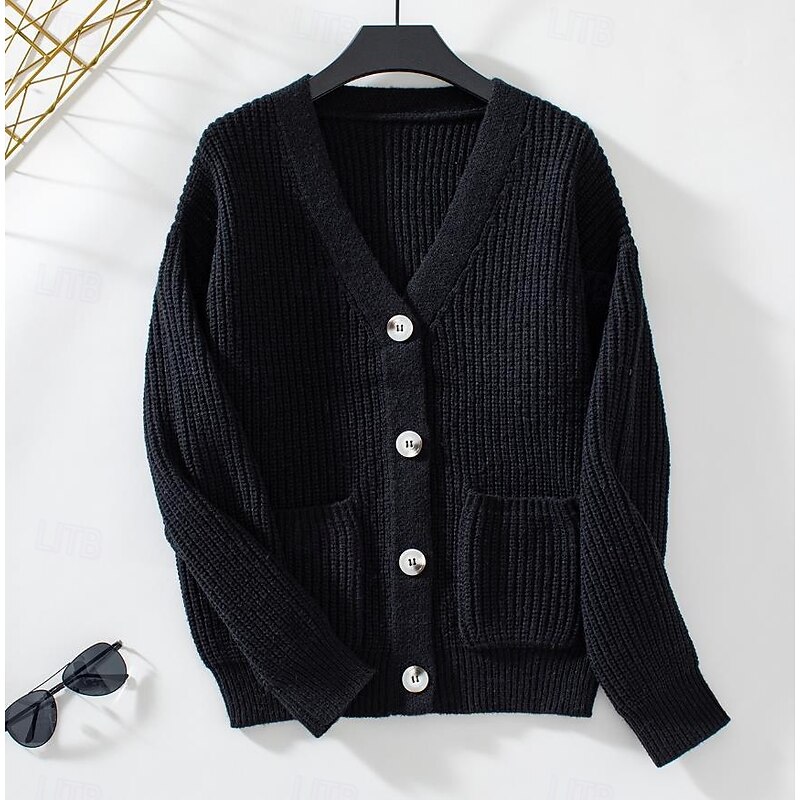 Highlights [Fabric & Comfort] : Crafted from a soft and cozy polyester blend, this women's cardigan is designed for a relaxed and micro-elastic fit, making it perfect for the chillier fall and winter months. The premium yarn ensures warmth and comfort without compromising on style. [Stylish Fit] : Featuring a loose fit design, this cardigan offers a laid-back yet chic look. The regular top length and V-neckline make it a versatile piece that can be layered effortlessly over any outfit. [Design Highlights] : With its pure color and fashion-forward knitted texture, the cardigan stands out with its elegant button-up style. The large, round buttons add a sophisticated touch, while the ribbed texture on the long sleeves provides a snug finish at the wrists. [Versatile Occasions] : Ideal for daily wear, this cardigan can be dressed up or down for a variety of casual events. Whether you're heading to a weekend brunch, running errands, or enjoying a cozy evening indoors, this piece adds charm and style to your outfit. [Size & Fit] : Available in sizes S, M, L, and XL, this cardigan caters to a wide range of body types. The loose fit and flexible sizing ensure that it suits different preferences, providing comfort and elegance for every wearer.