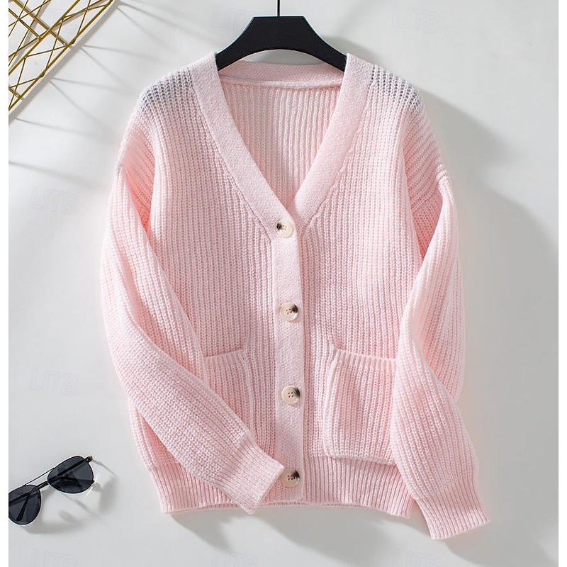 HOT ! Women's Cardigan Casual Pure Color V Neck Knitted Long Sleeve Regular Tops Knit Daily Black Pink Fall Winter