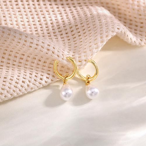Gold Pearl Dangle Earrings for Women, 14K Gold Plated Small Pearl Drop Huggie Hoop Earrings, Hypoallergenic Dainty Gold Earrings Wedding Jewelry Gifts for Women Trendy 6