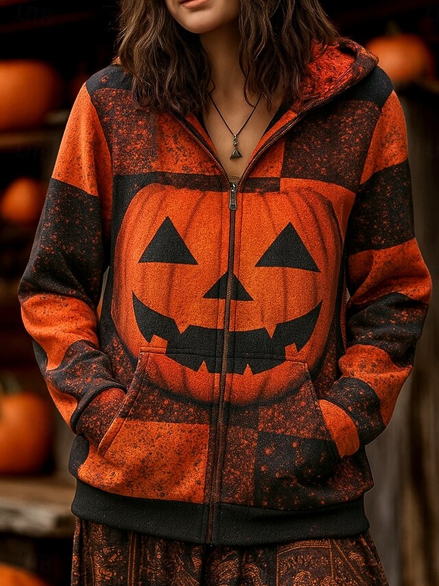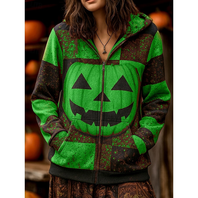 More information about Women's Zip Up Hoodies Graphic Skull Pumpkin Punk Fashion Retro Long Sleeve Hooded Regular Tops Street Dailywear Casual Zipper Pocket Print Purple Orange Green Fall Winter