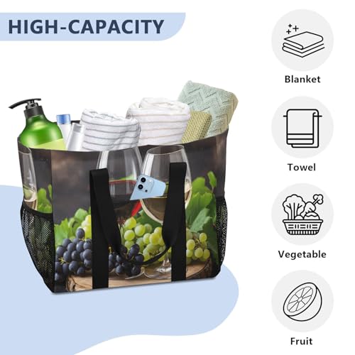 HOT ! Large Waterproof Travel Tote Bag for Women Men, Red Wine Grapes Leaves Canvas Beach Bag with Lining & Pockets - Reusable Grocery/Laundry/Kitchen/Pool/Picnic Tote (15.4x9.8x12.8in)