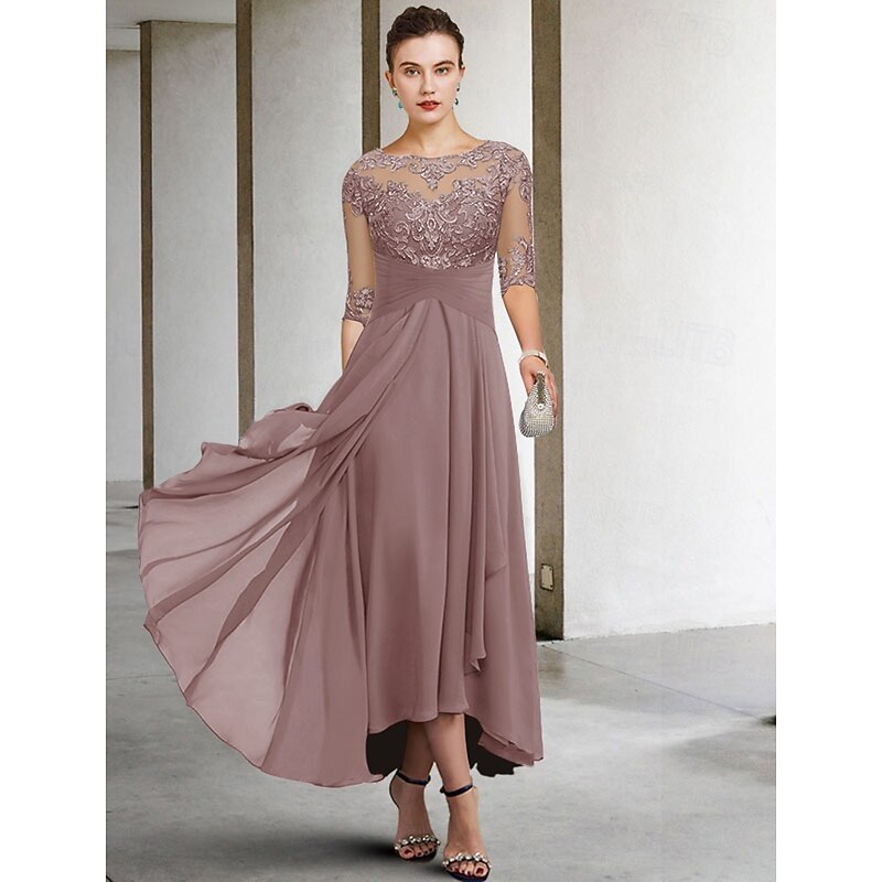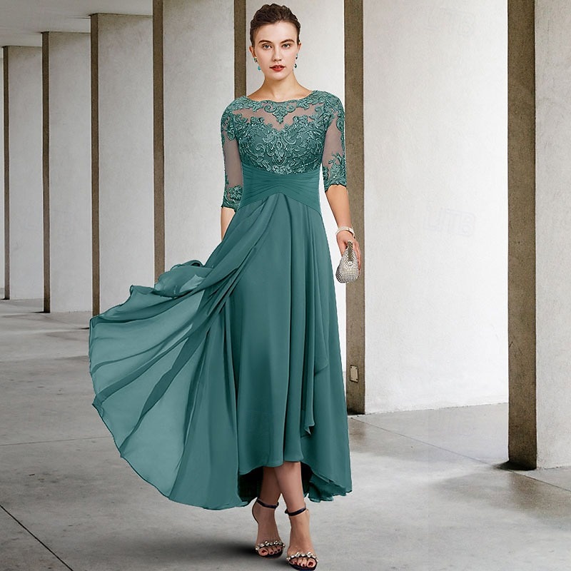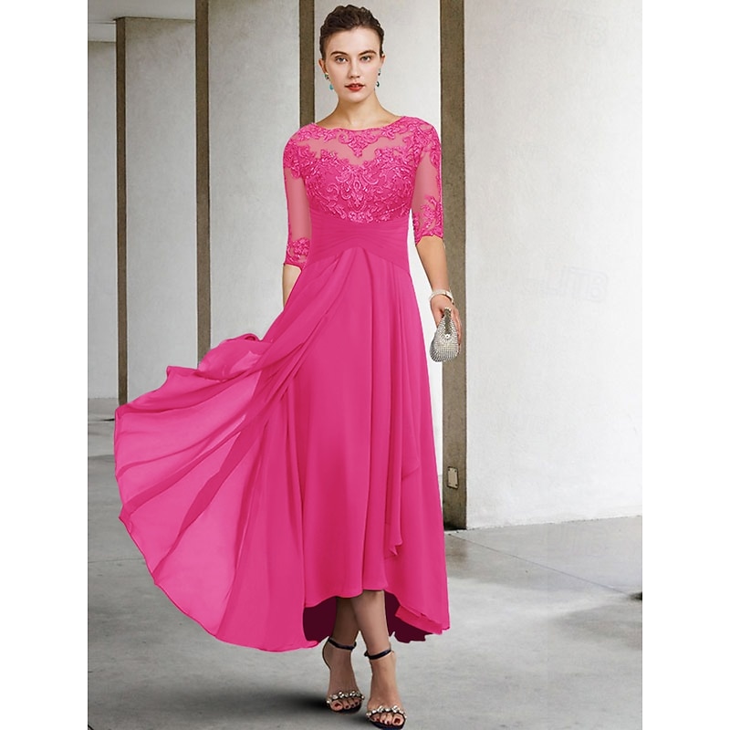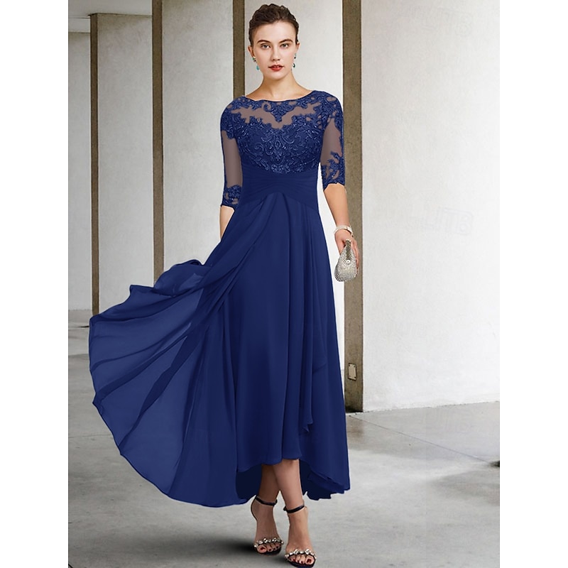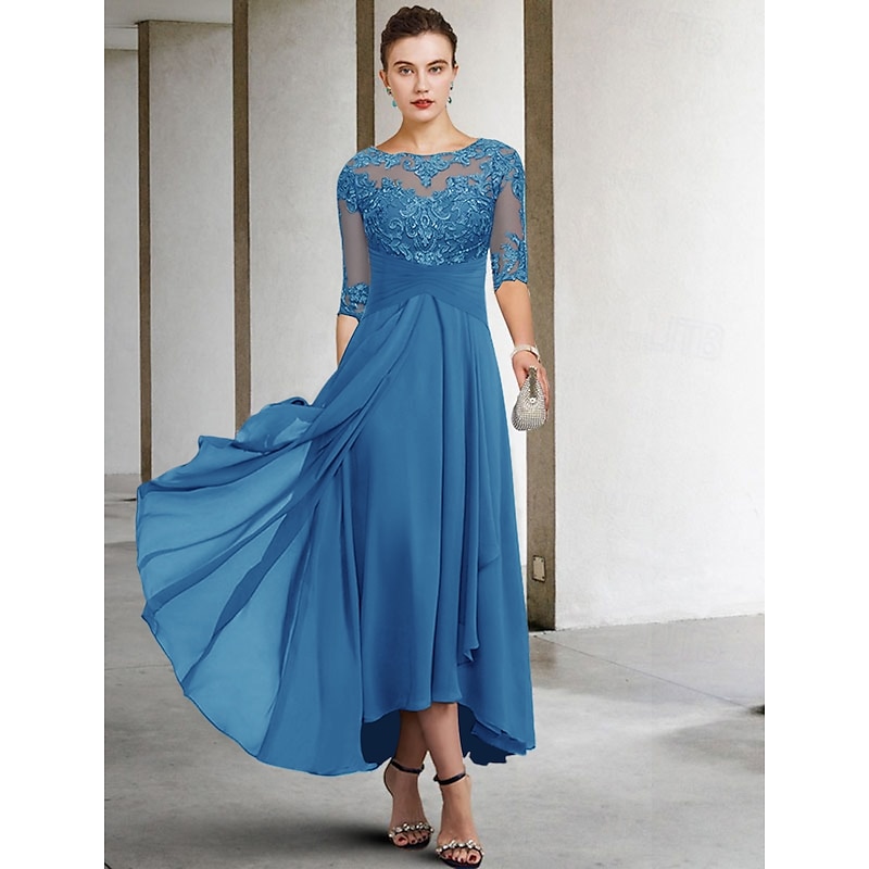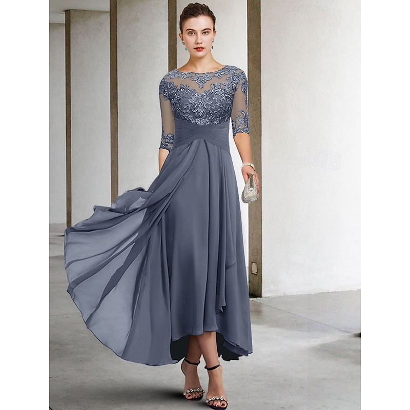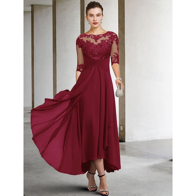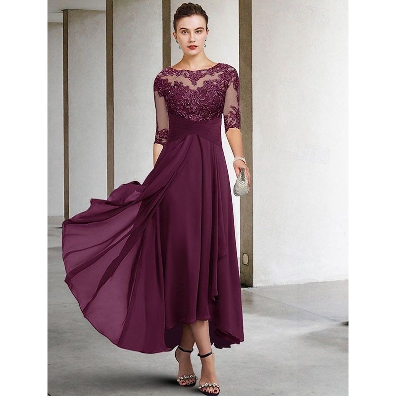 More information about A-Line Mother of the Bride Dress Wedding Guest Elegant Plus Size High Low V Neck Asymmetrical Ankle Length Chiffon Lace Half Sleeve with Beading Appliques