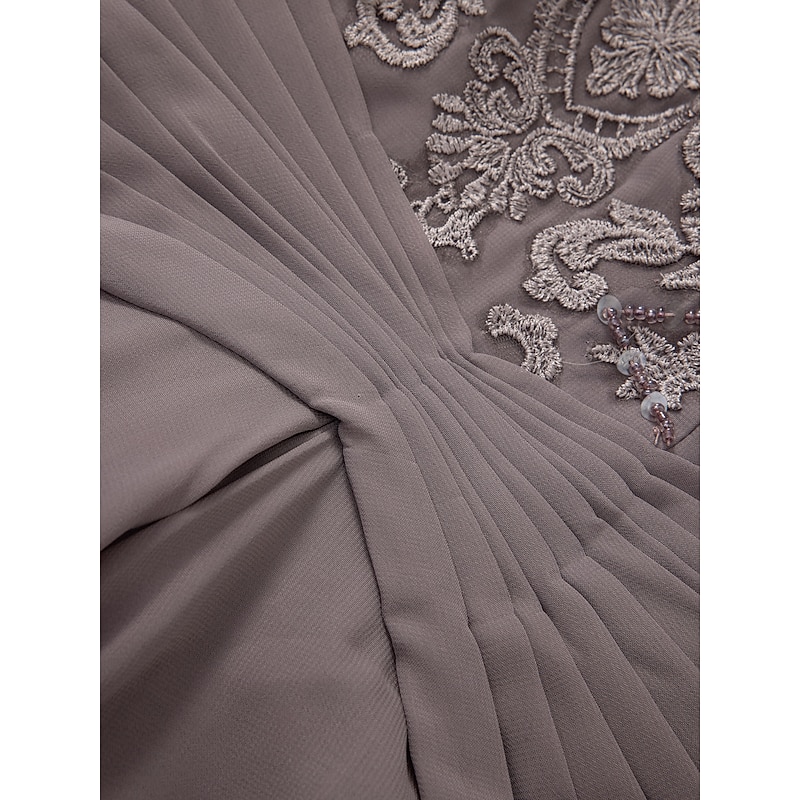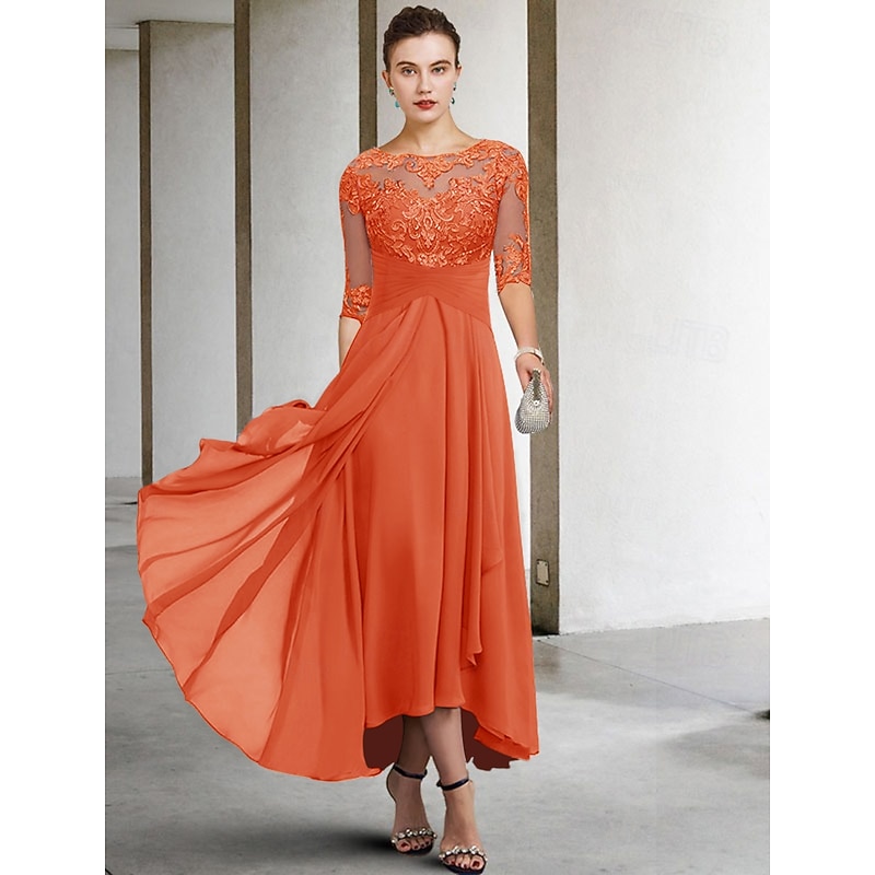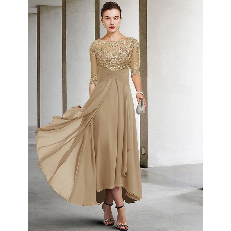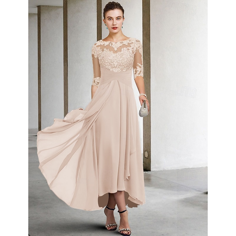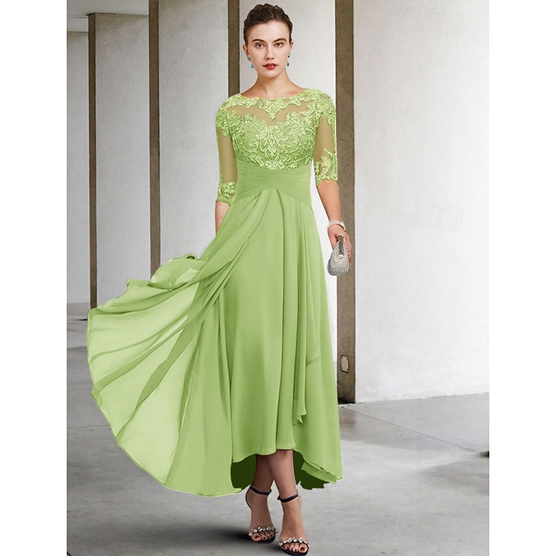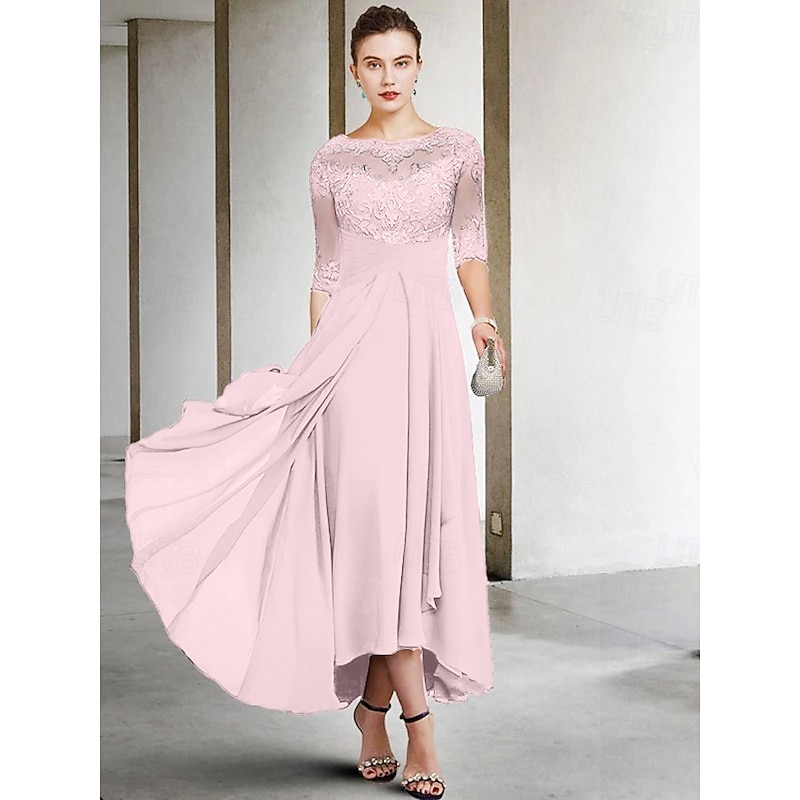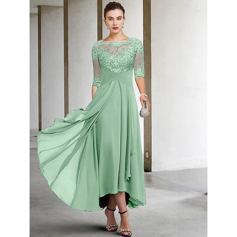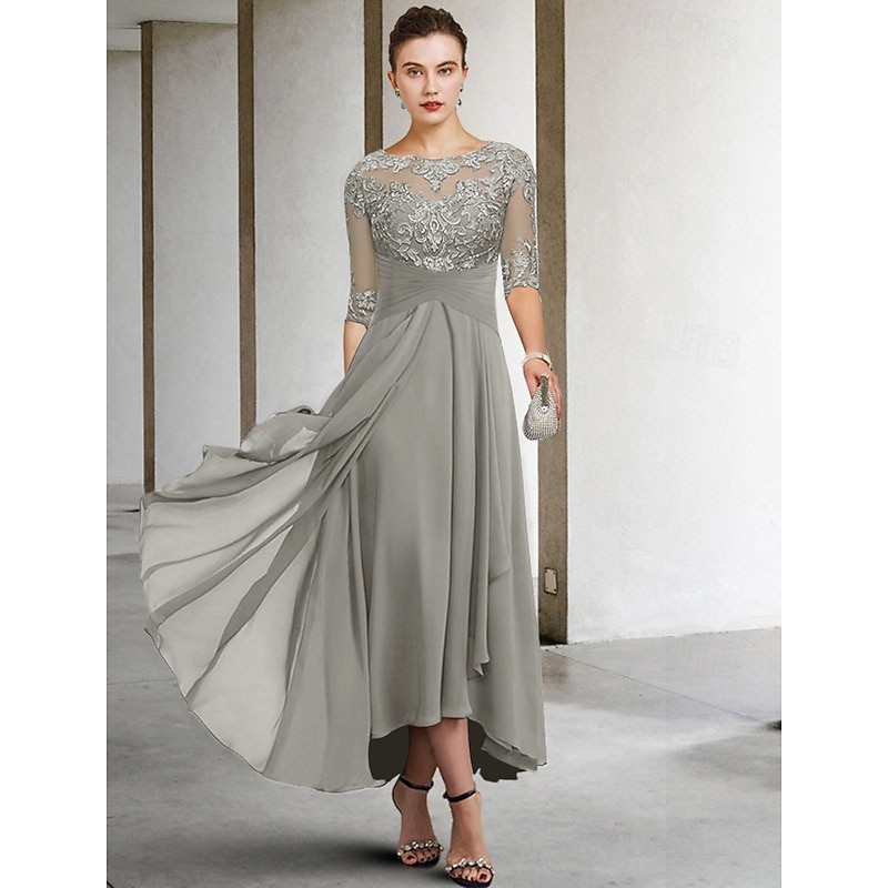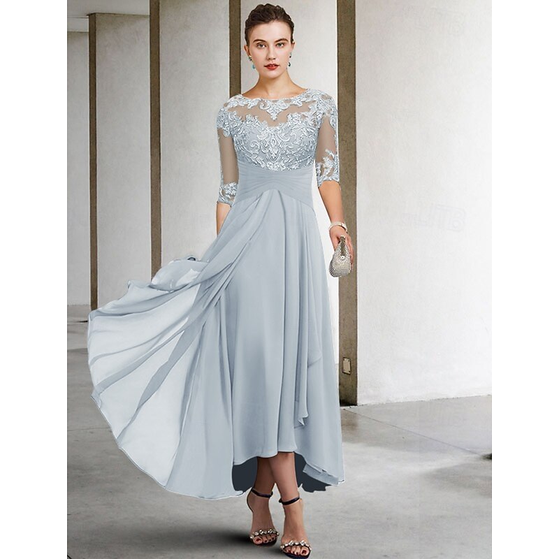 More information about A-Line Mother of the Bride Dress Wedding Guest Elegant Plus Size High Low V Neck Asymmetrical Ankle Length Chiffon Lace Half Sleeve with Beading Appliques