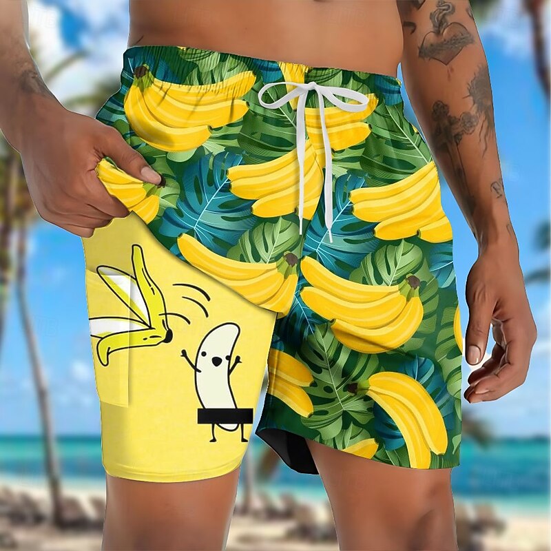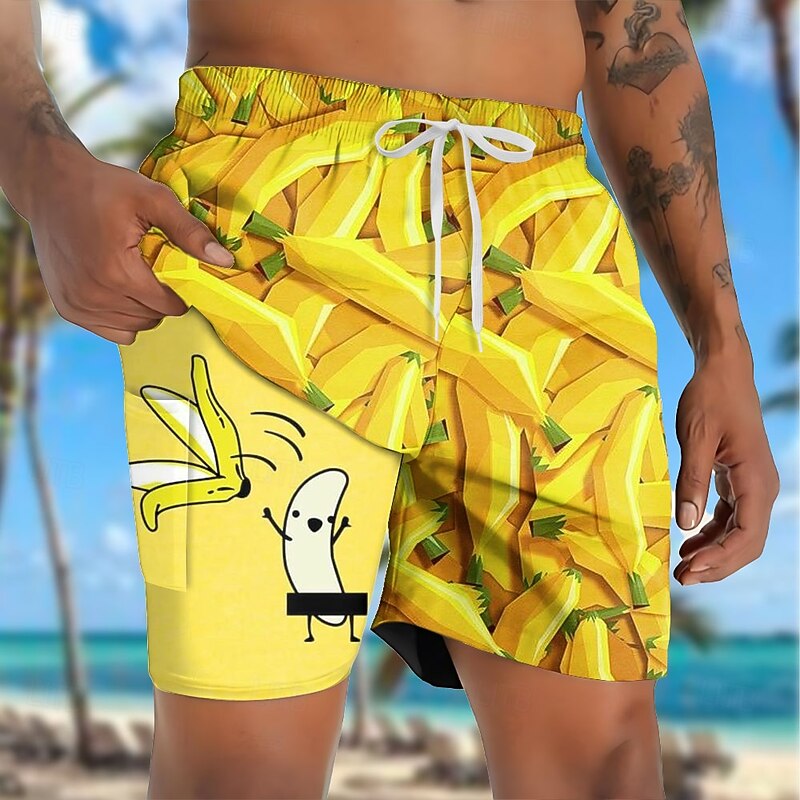 Men's Funny Banana Lined Shorts 2 in 1 Board Shorts Swim Shorts Mid Waist Hawaiian Vacation Holiday Beach Wear Side Pockets With Compression Liner Elastic Drawstring Waist Designer Clothing Apparel 2