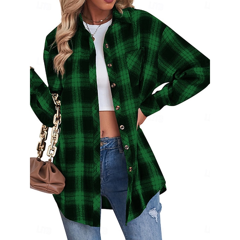 Women's Shirt Jacket Shacket Warm Breathable Buttons Pocket Print Casual Plaid Vacation Street Daily Wear Going out Single Breasted Regular Turndown Regular Fit Long Sleeve Outerwear Black Red Green 6