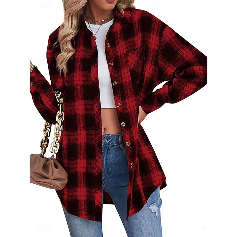 More information about Women's Shirt Jacket Shacket Warm Breathable Buttons Pocket Print Casual Plaid Vacation Street Daily Wear Going out Single Breasted Regular Turndown Regular Fit Long Sleeve Outerwear Black Red Green