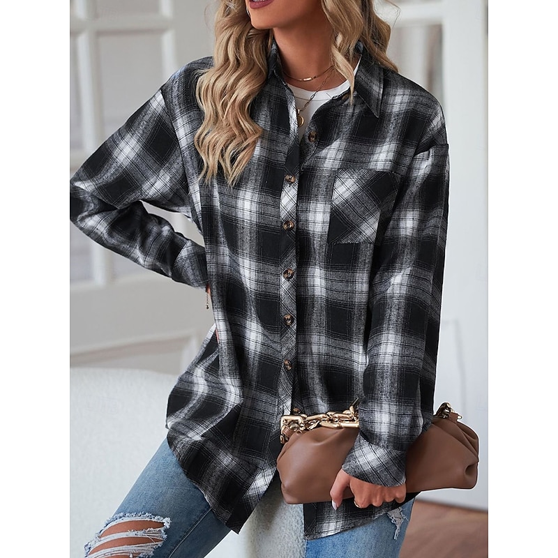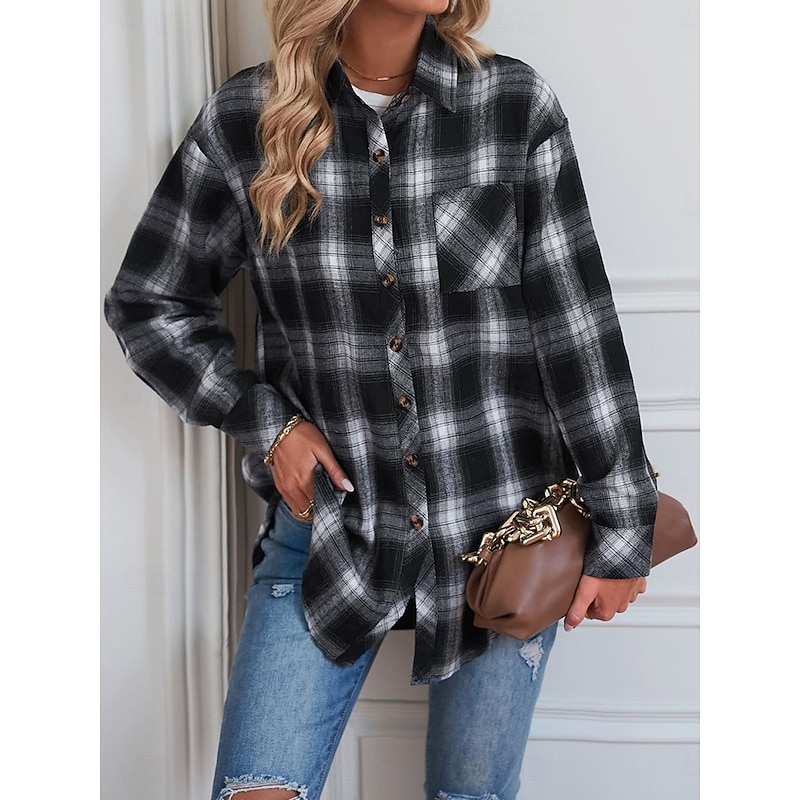 Women's Shirt Jacket Shacket Warm Breathable Buttons Pocket Print Casual Plaid Vacation Street Daily Wear Going out Single Breasted Regular Turndown Regular Fit Long Sleeve Outerwear Black Red Green 7