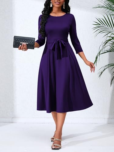 HOT ! Women's Caual Midi Dress 3/4 Sleeve Crewneck A-line Swing Dress for Women with Belt for Wedding Guest & Cocktail Party