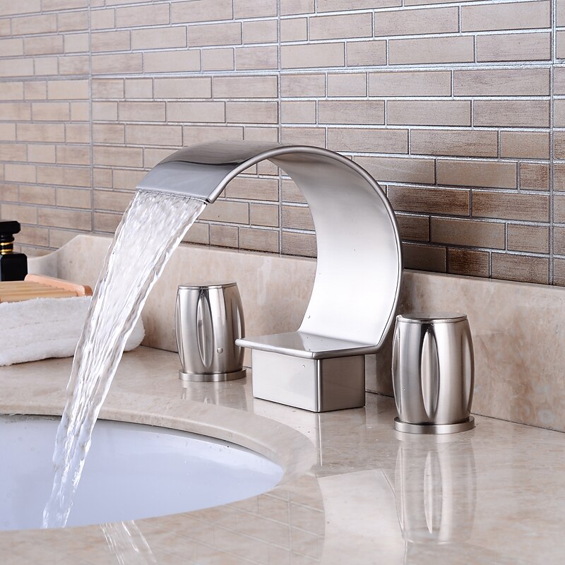 Widespread Bathroom Sink Faucet,Two Handle Three Holes, Brass Waterfall Chrome Bath Taps 3
