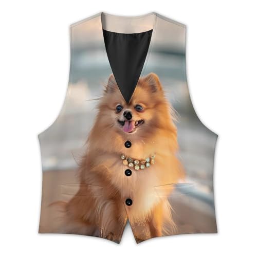 HOT ! Pomeranian Dog Beach Men's Suit Vest Waistcoat Vests Formal Dress with 2 Pockets for Business Casual Tuxedo