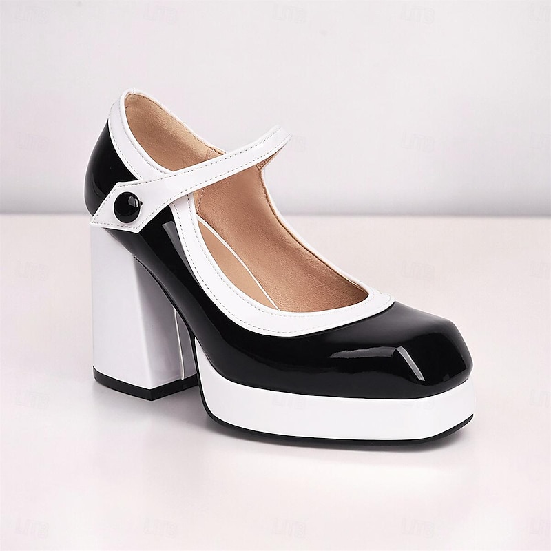 : These pumps showcase a striking black and white color block pattern, enhanced by a classic rounded toe and a chunky block heel that exudes both retro charm and contemporary flair. The adjustable strap across the instep, adorned with a button, not only secures the foot comfortably but also elevates the design with its vintage elegance.