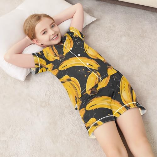 Satin Pajama Sets Short Sleeve Banana Pattern Print on Black Button Down Silky Nightwear 2 Piece PJS 5-14Y 6