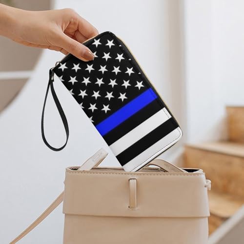 HOT ! Smooth zipper Leather Wallet for Women Men Water-resistant and Secure and Durable American Thin Blue Line Flag Police Pattern Black Wallets Gift for Birthday