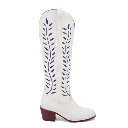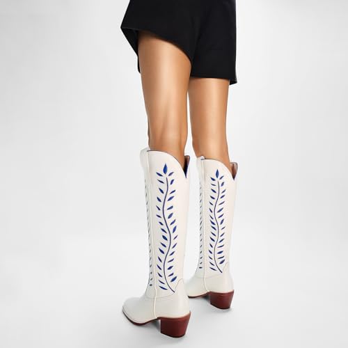 Yishaweiqi Embroidered Cowboy Boots for Women Almond Round Toe Chunky Heel Cowgirl Boots Pull On Knee High Western Boots with Contrast Foliage Inlay 6