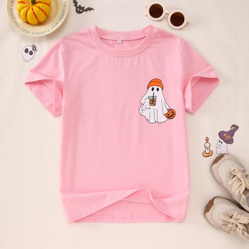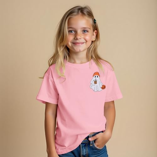 Girl Halloween Shirt Ghost Drinking Coffee Tshirt Pumpkin Short Sleeve Tee Top Kids Spooky Season Fall Outfit 7-12Y 7