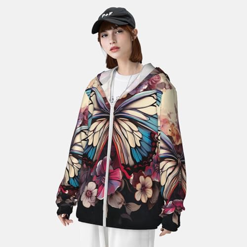 Fabric type: 100% PolyesterClosure type: ZipperNeck style: Hooded NeckSleeve type: Long SleeveCOOLING FABRIC: Butterfly Floral Long sleeve sun shirt are made of moisture-wicking fabric, the mesh panels at two sides enhanced ventilation. Sun jackets has perfect breathable and quickly wick away perspiration, keeping you dry and comfortable every day.GREAT DESIGN: Our sports jacket zipper and hooded design,easy to wear and take off,fashion goes with everything. Sun protection jacket hooded elastic band design at the hem and cuffs,one inner pocket on the left. A practical option if you want to choose a comfortable work shirt for men summer clothes.EXTREMELY PRACTICAL: Long sleeve UV shirts can machine cold wash. Durable fabrics keep from pilling and shrinking after repeated washing.Men's long sleeve rash guard fits easily in your luggage, backpack or tote bag for on-the-go convenience.Long Sleeve Sun Shirt: Men's upf 50+ jackets use ultra lightweight, soft sun shirt is cool to the touch. Designed non-restrictive cut allows for optimal range of workout. Sun shirt for women will be your new go-to summer essential.STAY FITTED AND contemporary: Butterfly Floral Sun protective shirts is lightweight and fitted without being too tight, making it great for fishing, running, golfing, biking, and all kinds of outdoor activities. Plus, rash guard shirt makes the perfect valentine's day gift for your husband in any occasion. Perfect for everyday use. supreme materials and excellent craftsmanship ensure long-lasting durability.