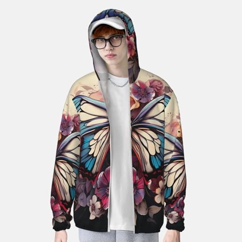 Men's UPF 50+ Sun Protection Hoodie Long Sleeve Fishing Shirts swift Dry Butterfly Floral Sun Shirt Jacket