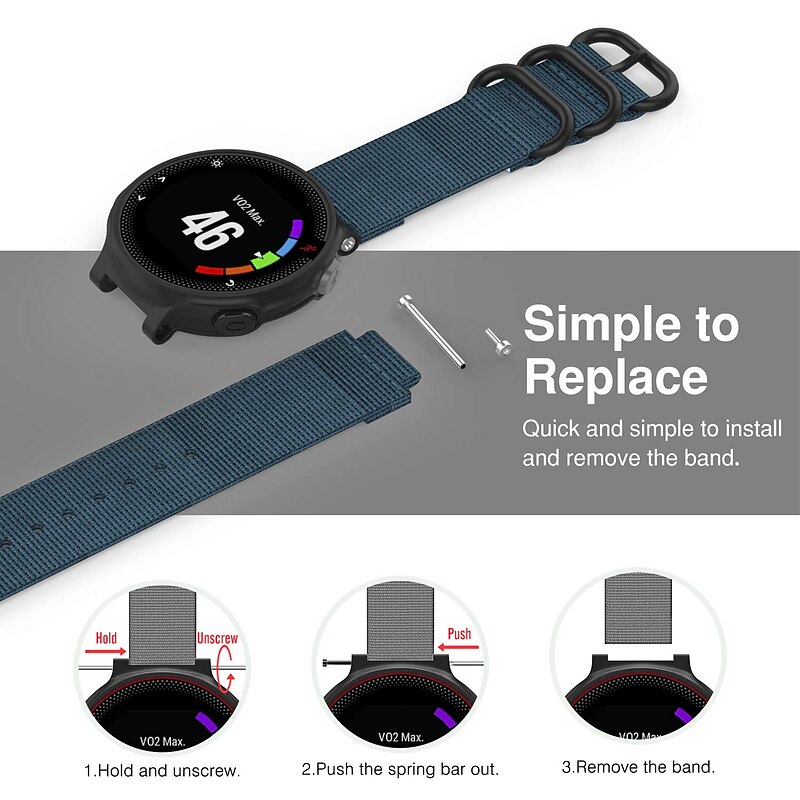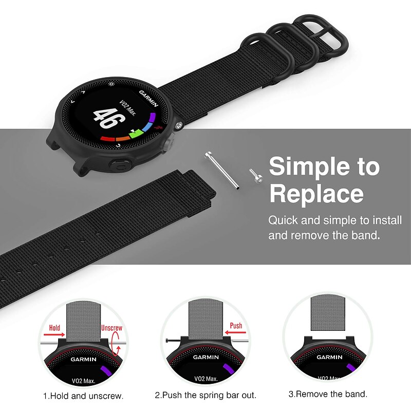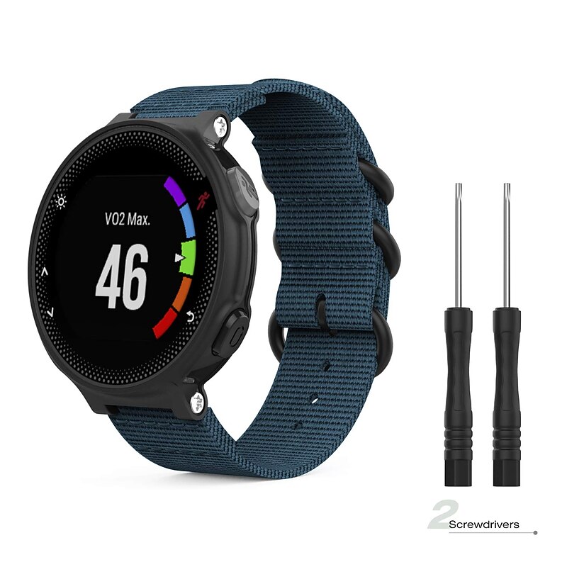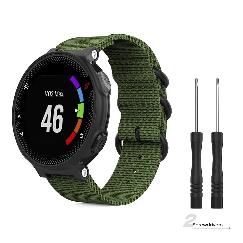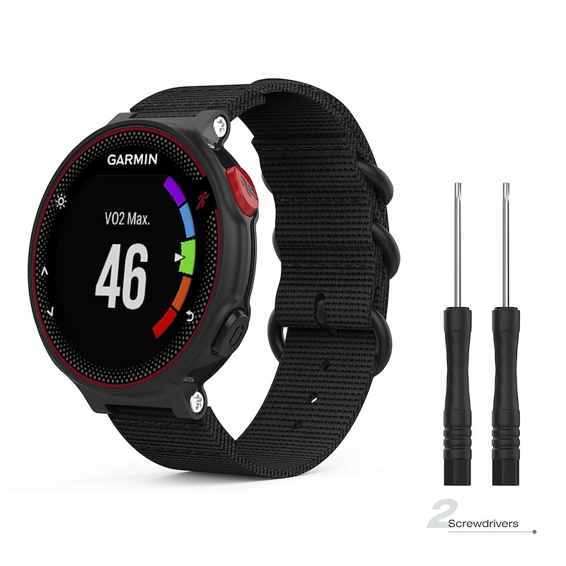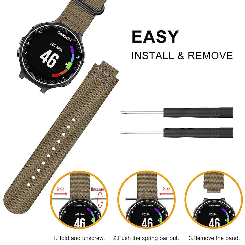 Highlights 1. Personalize your Garmin Forerunner smart watch with this refined replacement wrist band compatible with several models. 2. Easy and direct installation and removal onto watch lugs to ensure a secure fit. 3. An innovative pin-and-tuck closure system ensures a clean, precise fit. 4. Made with premium nylon material with moderate softness and fine craftwork, making it comfortable and durable. 5. Hypoallergenic nickel-free stainless steel used for metal parts. 6. Fits a wide range of wrist sizes from 5.51-7.87 (140mm-200mm). 7. Comes with 2 screwdrivers for easy DIY installation. 8. (Note: Watch NOT included.)