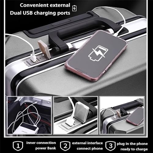 Carry-on Luggage: Luggage features a durable, lightweight hard shell that absorbs shock for smoother, quieter, and more durable use. For maximum impact resistance and durability.Easy To Manage: The swivel wheels allow for smooth 360-degree rotation, making it easy to maneuver through crowded airports or busy streets.Ergonomic Design: The telescoping handle can be adjusted to your preferred height, reducing stress on your arms and shoulders.Note: The suitcase itself does not have a power storage function, it only has a USB interface, and you need to bring your own mobile power supply to charge it.Ergonomic telescopic handle: Adjustable to different heights to suit different people, smooth up and down design, brings a smooth and sleek experience, and the wheels do not make any noise when rotating.