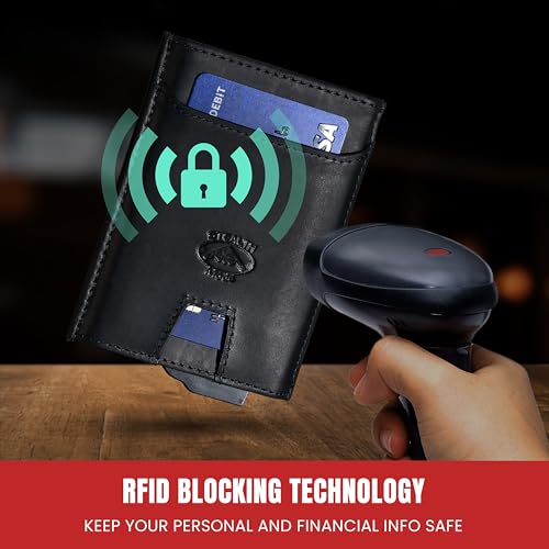 Brand: Stealth ModeColor: BlackMaterial: Aluminum, LeatherStyle: Modern Metal Wallet for Ment With Vintage Leather CasePattern: SolidEffortless Card Access - No more struggling with stuck cards! With this minimalist wallet's innovative mechanism, your cards automatically pop out with a simple push, making them easier to take out.Slim Profile, High-Capacity - At 3x4”, this card wallet for men is streamlined for an ultra-slim fit in your pockets. Despite that, it can hold up to 8 credit and debit cards, an ID, and some bills.Complete Data Protection - Stay secure from digital theft with our pop up wallet's RFID-blocking technology. This vital safeguard prevents criminals from stealing your personal and financial information.Durable Craftsmanship - Experience unmatched quality with our Napa leather wallet's refined elegance. This premium material ensures lasting durability and develops a beautiful patina over time.A Gift for Him - Practical and stylish, this cool wallet makes an ideal present for every man. It comes with a gift box packaging and is available in 4 colorways: Black, Brown, Grey, and Carbon Fiber.