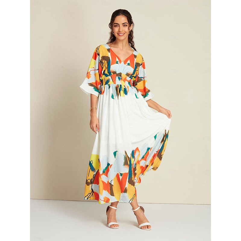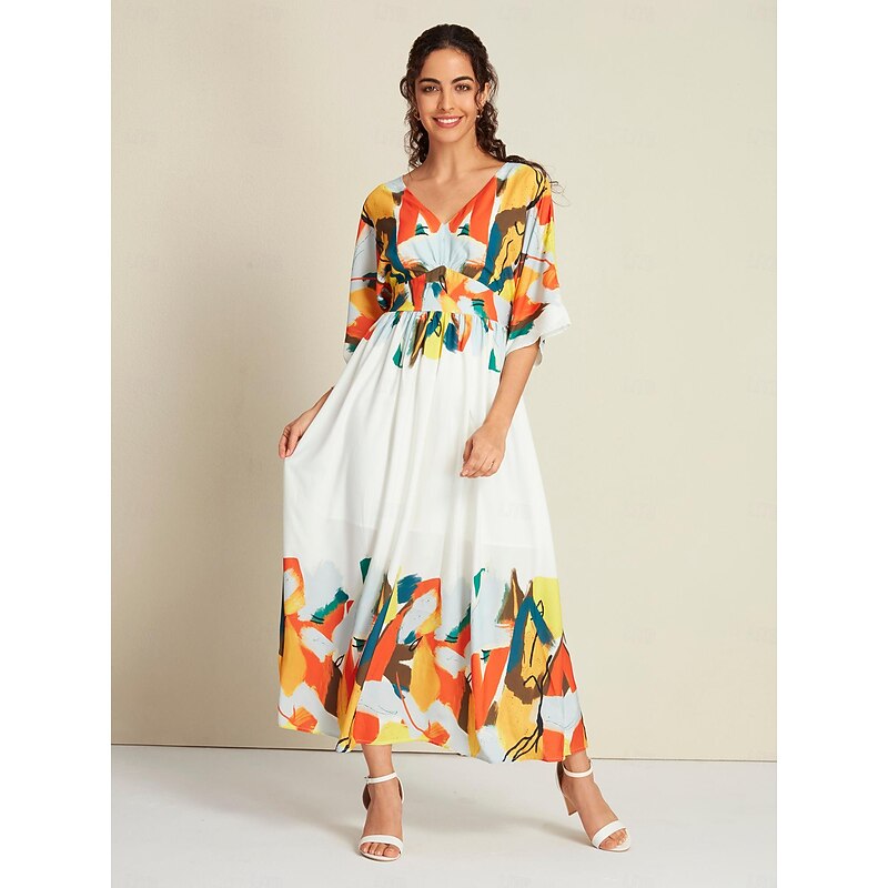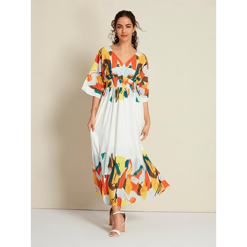 Satin Graphic Tie Back V Neck Half Sleeve Hem Maxi Dress