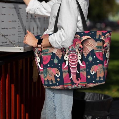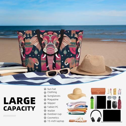 Bohemian Elephant Pattern Print Large Waterproof Beach Bag For Women With Zipper And Pockets For Travel Vacation
